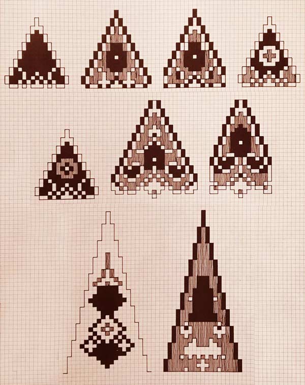 However not all writers agree with an Indian patola origin. In Malaysia and Sarawak tumpals are regarded as stylised bamboo shoots (pucuk rebung). Alternatively they are said to represent hills or mountains (Manansala 2016, 405). Other scholars believe they symbolise the cosmic Mount Meru where the gods abide (Abu Bakar 2002, 47; Lee 2006; Lee-Niinioja 2010, 126). Holmgren and Spertus point out a possible connection to aligned rows of tumpal shapes incised on early Austronesian Lapita ceramics (1991, 75). Another idea is that they originate from the Dong Song culture of southern China/north Vietnam – rows of small tumpal-like triangles appear as circular outer borders on some bronze drums. Tjandrasasmita and Lee-Niinioja note that the tumpal is one of the most widely distributed pre-Islamic ornamental motifs found on Buddhist-Hindu temples, including those on Java, some of which date back to the fifth century (2008, 117). Whilst acknowledging that the origin of the tumpal remains uncertain, they suggest it at least dates back to ancient Neolithic or megalithic times.