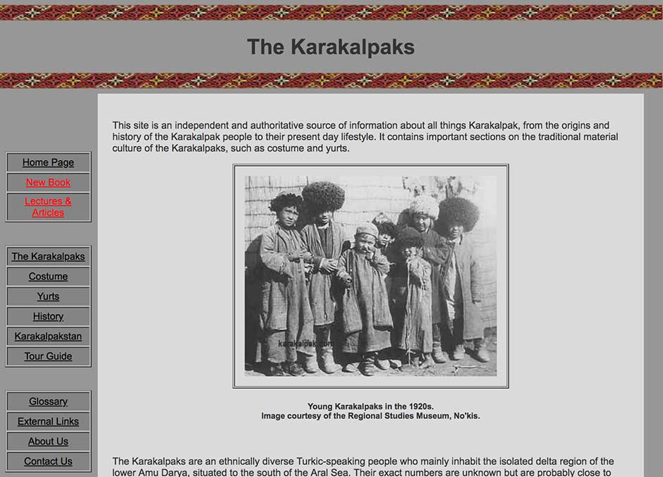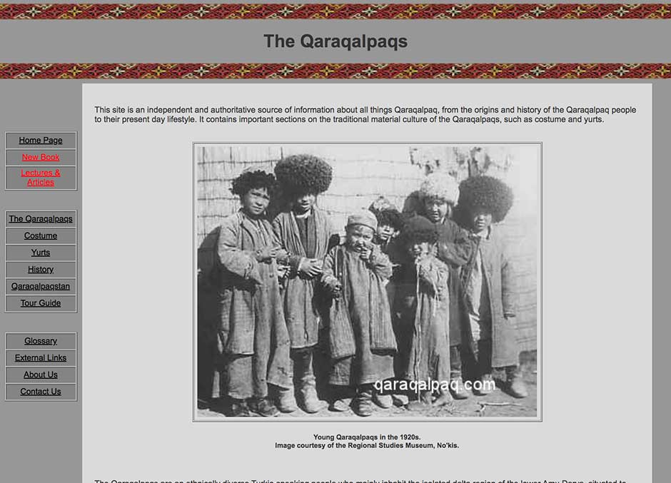In 1996 we began to explore Central Asia, becoming intrigued by the history and material culture of remote Qaraqalpaqstan and Khorezm, both located just south of the Aral Sea in far western Uzbekistan. We spent at least a month in the region every year, also exploring Turkmenistan, Kazakhstan and Kyrgyzstan. We initially published the results of our research in two websites - www.karakalpak.com and www.qaraqalpaq.com. Our research culminated in the production of our book - Qaraqalpaqs of the Aral Delta - which was published by Prestel in 2012 and remains the main source of information on the Qaraqalpaqs in the English language.