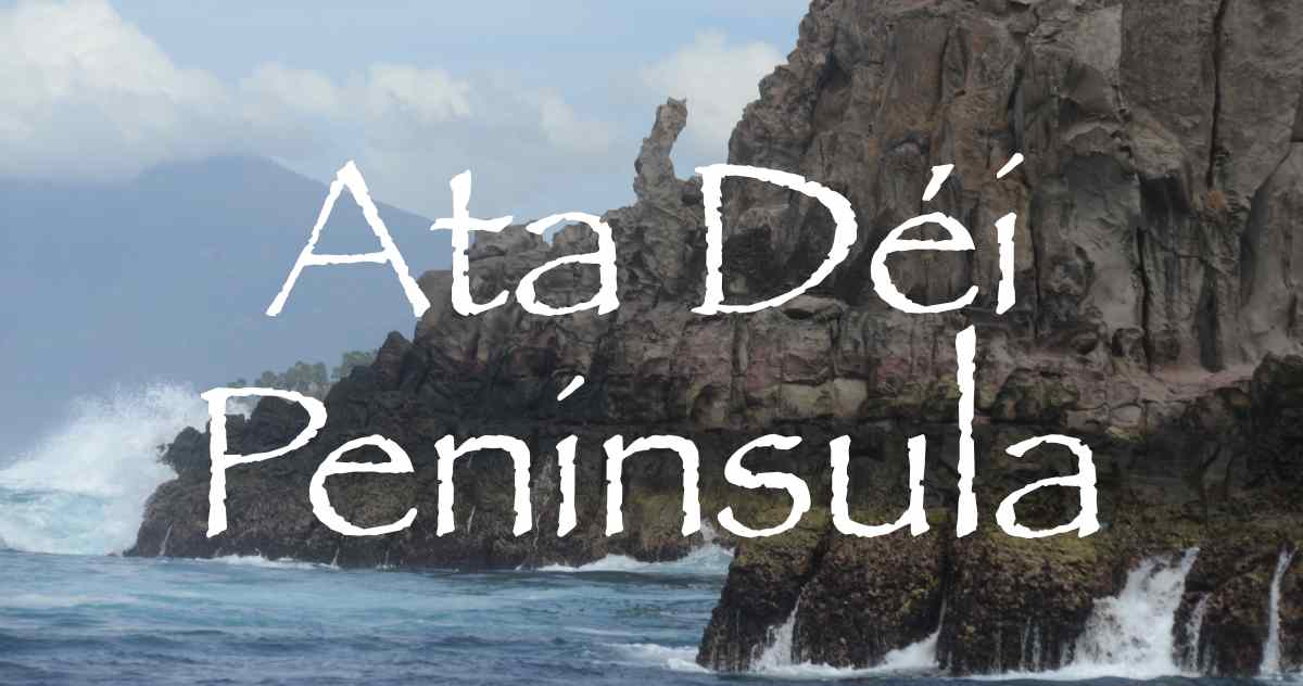 In the local Lamaholot dialect, the name Ata Déi means standing man, a reference to the natural rock pillar located on the south coast of the peninsula. A local legend says that it is the fossilised body of an old woman who was responsible for the flooding of Keroko Pukan, two small islands to the west of Lembata that were the home of many of the local people’s ancestors (Barnes 1996, 58). Today those islands are known as Lapan and Batan.