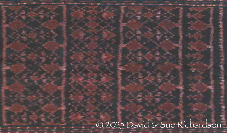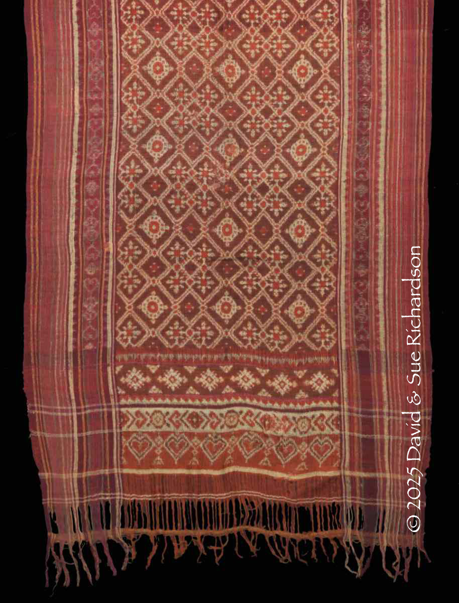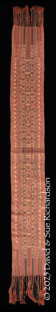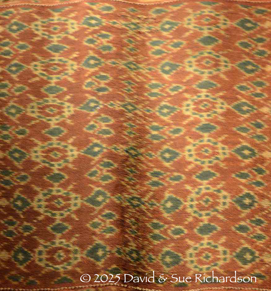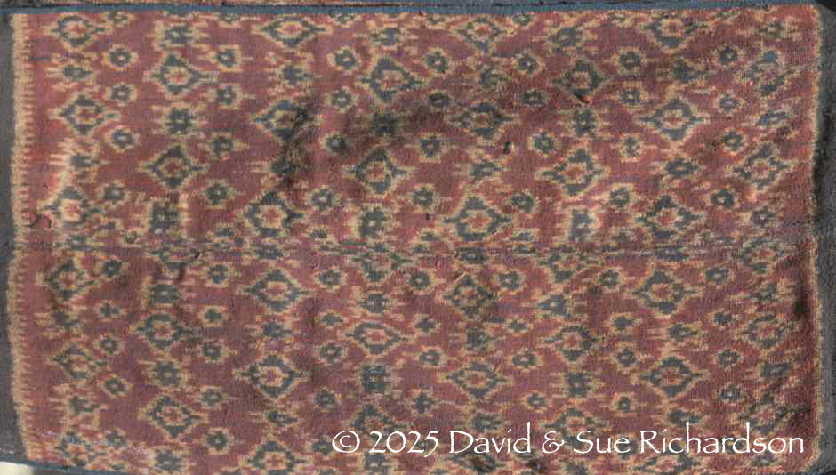 The end panels are almost completely filled with a cluster of narrow, ikatted and plain warp stripes and bands, apart from one outer plain band of morinda – the howin (pron. hovin). The ikat stripes and bands are decorated with simple geometric motifs, the largest being triangles, diamonds and diagonal crosses.