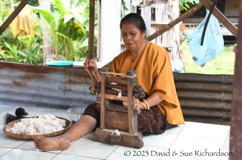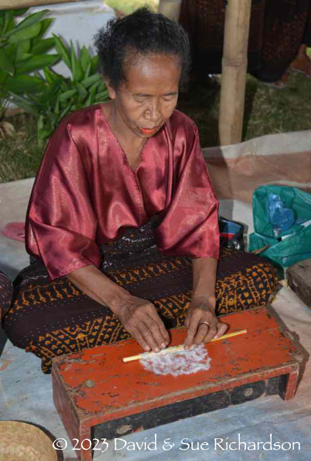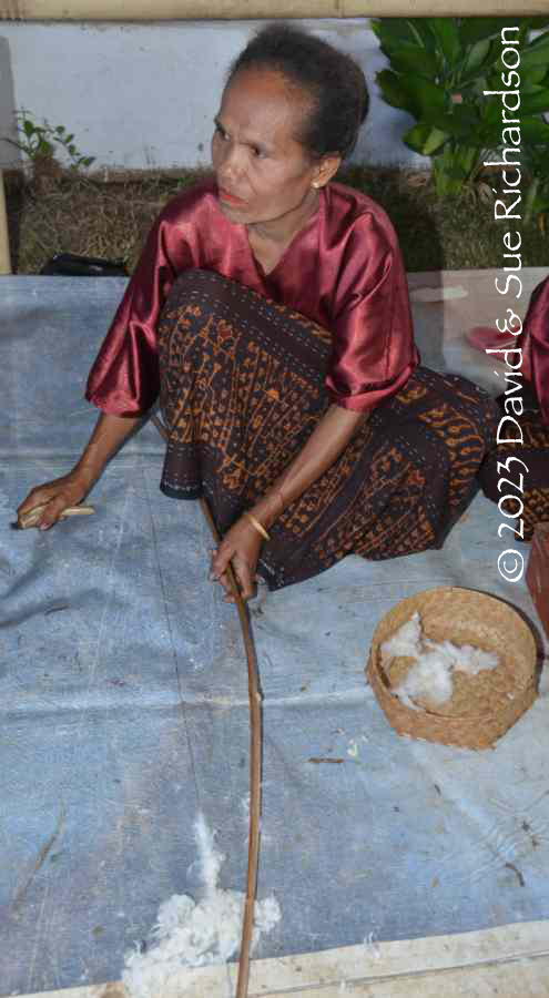 The first stage is to clean and separate the cotton, a process called pili wara. The cotton bolls are first dried in the sun for a day and are then de-seeded using a wooden ngeu gin, which has counter-rotating rollers that pull the fibre away from the cottonseed, allowing the cotton fibre to be collected in a palm leaf basket. The cotton fibre is then cleaned by hand.