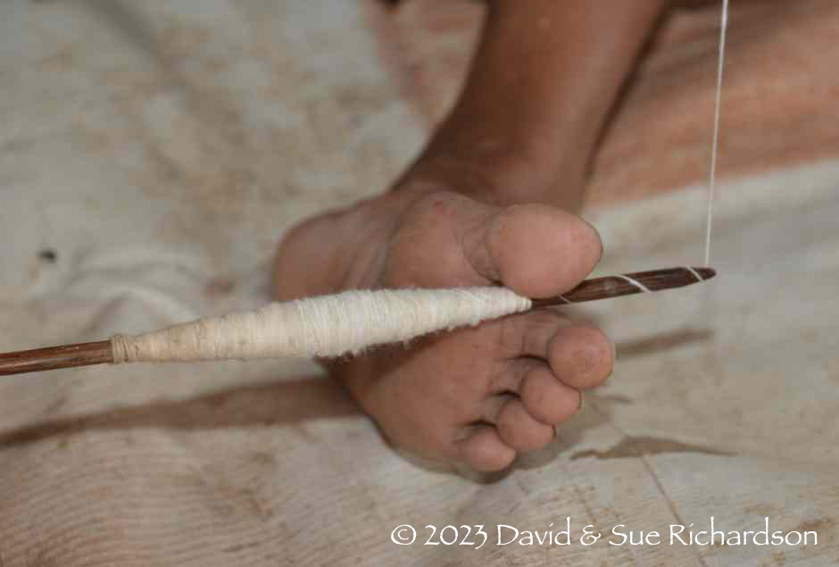 The spinner sits beside her spinning wheel, holding the puni in her left hand. The fibres are gradually fed out between the thumb and forefinger to be twisted by the rotating end of a short wooden spindle known as the gai. This is driven by a tight cord wound around the spoked wheel operated by the right hand. The end of the spindle is supported between the big toe and the toe next to it. Once the spun yarn is sufficiently twisted, the length of spun yarn is allowed to wind onto the wooden spindle and the process is repeated.