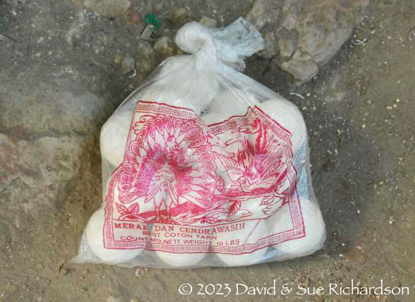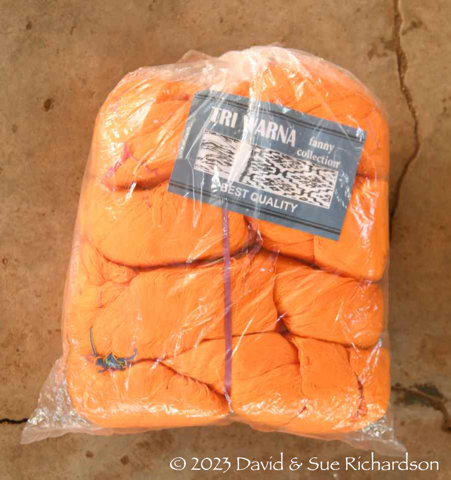 Viscose rayon yarn is generally purchased in two colourways, white and yellow/orange, the choice depending on what type of effect the weaver wants to achieve with the undyed motifs. The Nggela weavers call this rayon yarn bordir. The two colours produce very different-looking textiles, the white rayon appearing more traditional while the yellow/orange rayon gives rise to textiles with an unattractive artificial yellow caste. Although viscose rayon has a silk-like feel, it is made from wood pulp, so it has similar properties to cellulose fibres. The main brand sold at Wolowaru is Fanny Collection Tri-Warna.