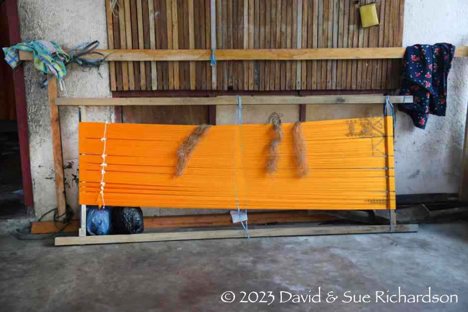 The next stage involves assembling the dyed and starched warps in the correct order so that the ikat pattern can be focussed. To do this the warps are stretched out on an upright bamboo dao frame, which has a fixed end beam attached to an inner moveable beam by loops of rope. The warps wrapped around the moveable beam can be tensioned by twisting the rope loops with a short stick.