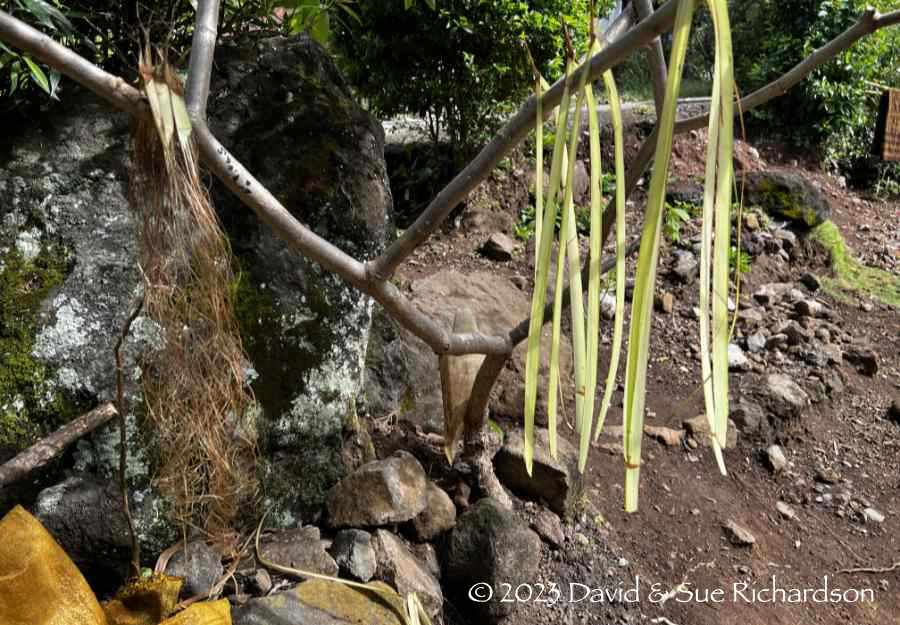 As with most Lio ikat producers, Nggela artisans bind their warps using fine strips of dried coconut palm leaf, which is known as lavinio. Endenese producers generally use strips of dried cabbage palm leaf, known as gewang. The strips are cut from each single leaf using a very sharp knife and then hung up to dry. Today some weavers prefer to use plastic string.