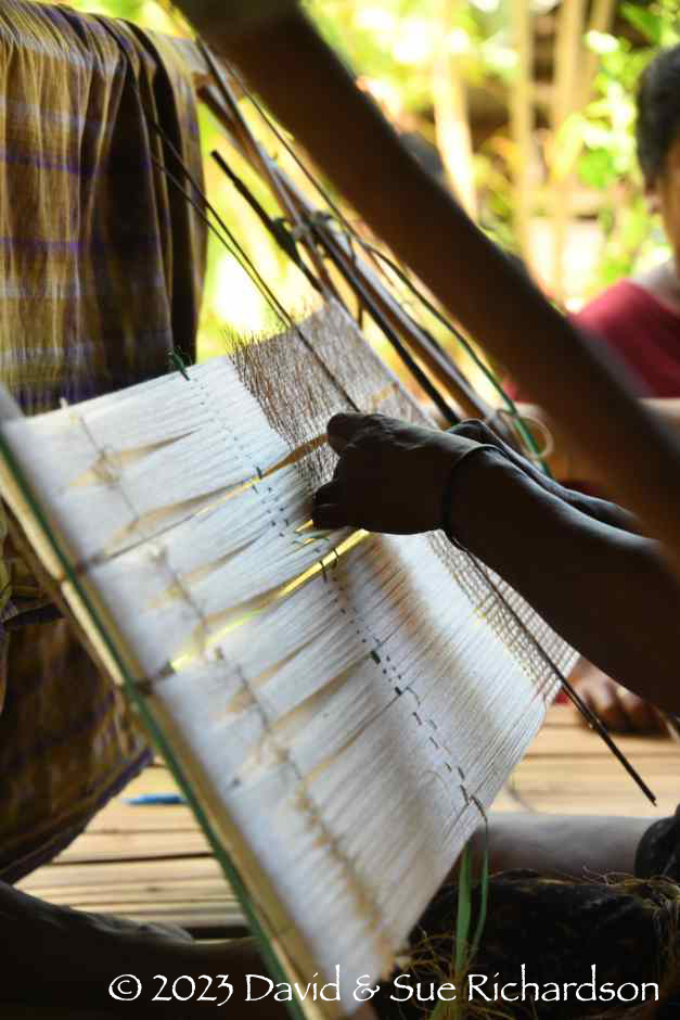 First the warps are separated into the upper shed and the lower shed by inserting a bamboo pole and progressively arranging alternate warps so they are above and below the pole. Now the heddle stick, known as the wulu, is placed on top of the pole and the heddle, known as the guru, is created by looping a long yarn around the heddle stick and under each lower warp - a laborious task.