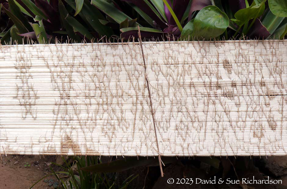 Before tying they wet the dried strip of coconut leaf with water to make it supple. The patterns are bound from memory, the bundles being tied with knots that have a long tail.