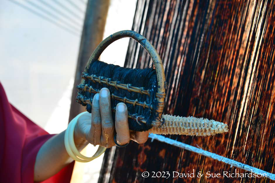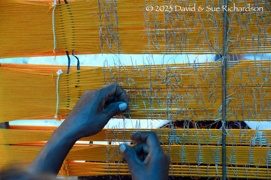 In the case of the dyed threads for the weft, these too are wound into skeins and dipped into the starch solution before being hung up to dry. Once dry they are placed on a swift and wound into a ball. When required they can be wound onto the stick-like shuttle, known as a lelu poké.