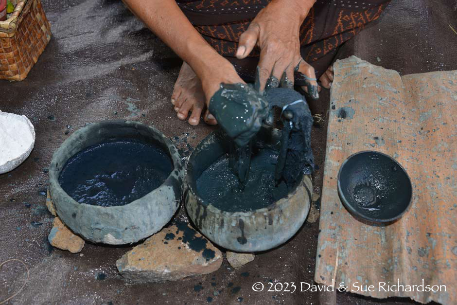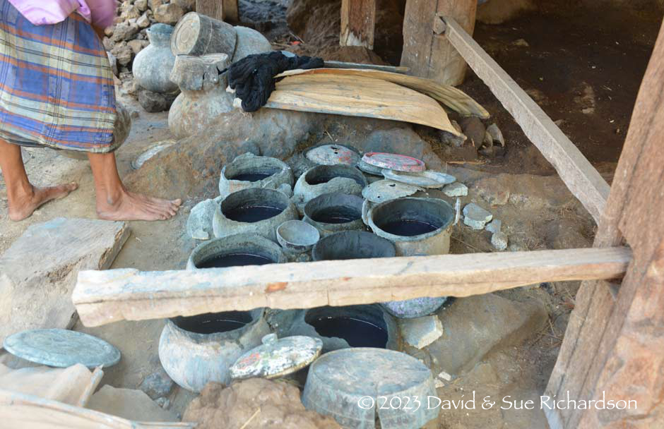 While indigo is called tarum, the process of indigo dyeing is called nggili, or as Teresia Korse describes it, podo nggili, the podo being the small pottery container that holds the dye bath. These pots are made locally.