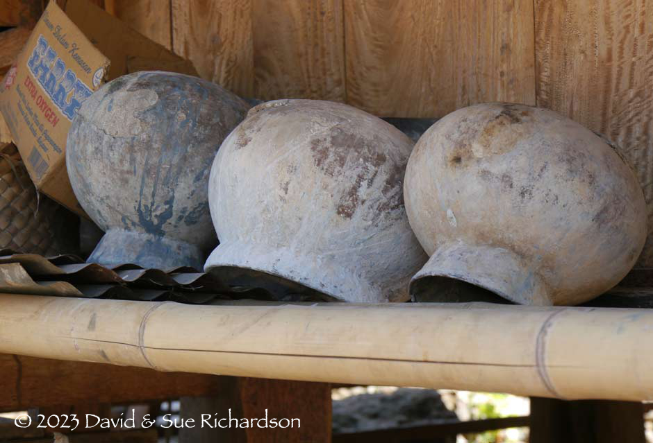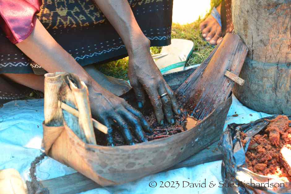 Many women in Nggela know how to dye indigo, and almost every weaver has a dye pot under her house. There are also a few specialists, one of the most experienced being Teresia Korse who is married to Raymondus Ada.