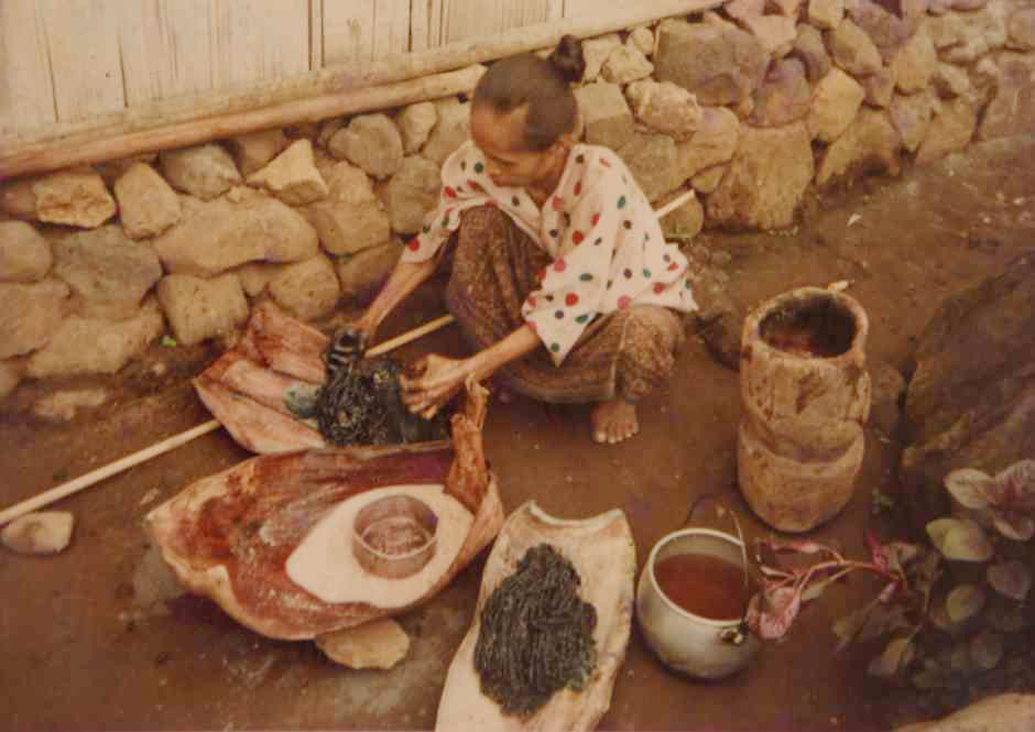 For the next stage, dyeing with morinda, the dried morinda root must first be crushed into a powder by pummelling it in a wooden mortar - a strenuous task.