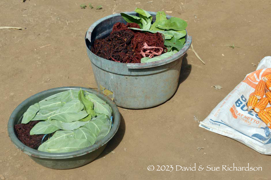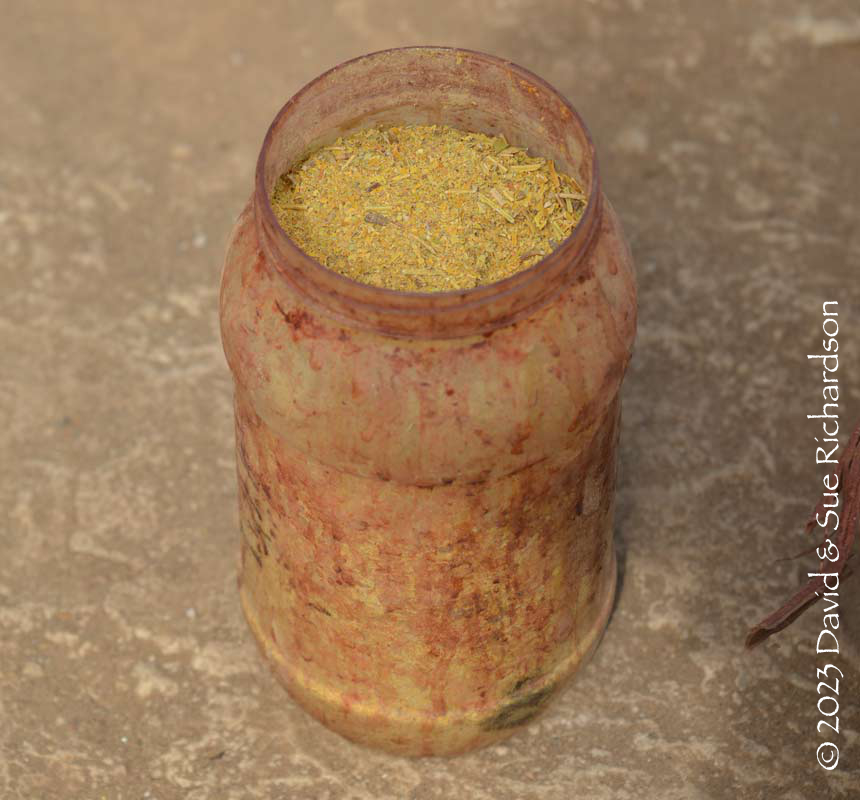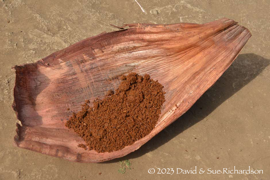 To prepare a morinda dye bath handfuls of the crushed root are added to water, along with some powdered loba but without the addition of ash water. The loba is bought in powder form from Detu Keli, which is 40km from Moni on the right side on the way to Ende and 30km from Wolagai. In 2018 it cost Rp. 40,000 for a small cupful.
