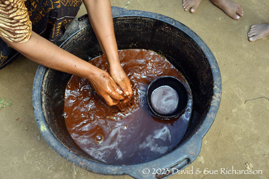 The morinda pulp is repeatedly squeezed to ensure that all the morindin dyestuff is extracted from the root and dissolved in the water. Now the yarns can be immersed in the dye mixture and pressed with the fingers to ensure that the dye penetrates all of the individual yarns.