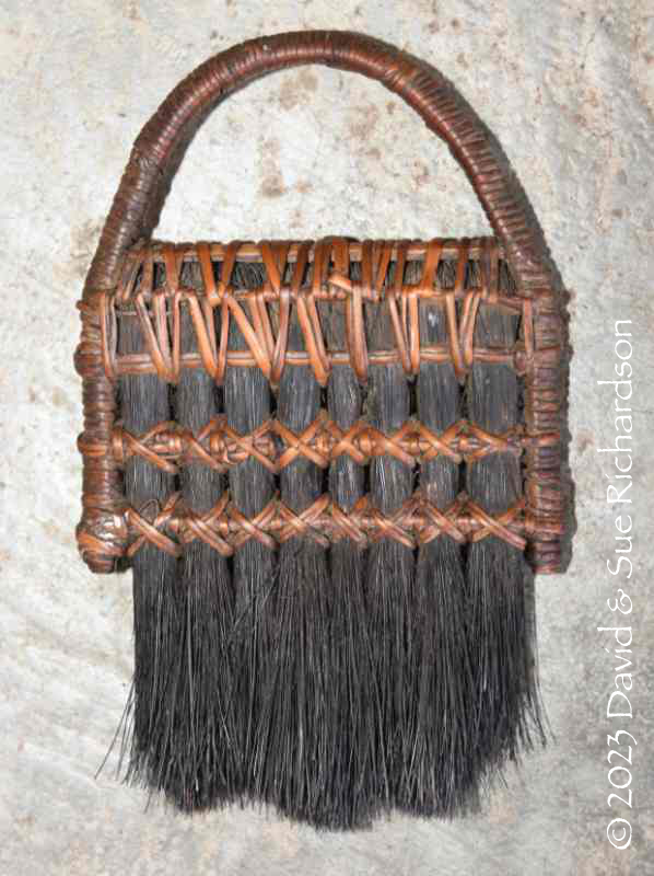 Once the warps have been assembled and focussed, they are starched for a second time, a process called woe. The dao frame is turned upright and the starch applied using a large nggae brush made from the black fibres of the palm tree.